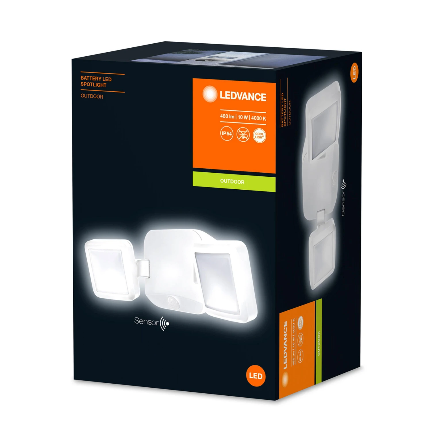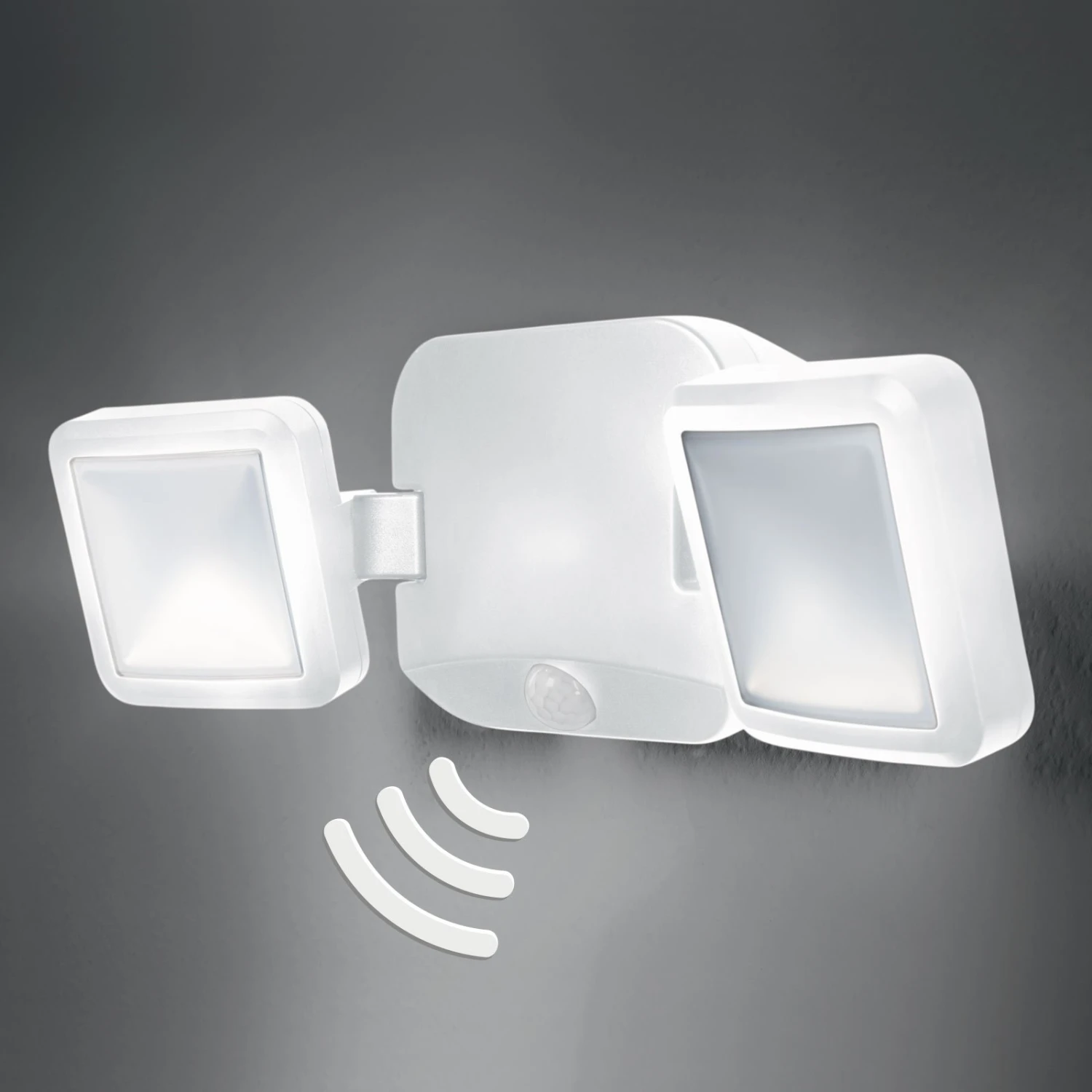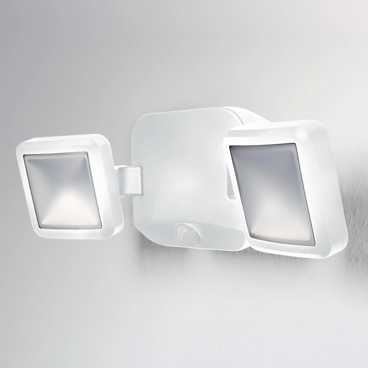 Die Außenwandlampe Battery LED Spotlight hat an beiden Seiten jeweils ein Leuchtmittel, das nach Belieben in seiner Strahlrichtung variiert werden kann. Die Außenwandleuchte besticht durch ihren klaren, weißen Farbton und reagiert durch integrierte Bewegungssensoren auf jede Bewegung.