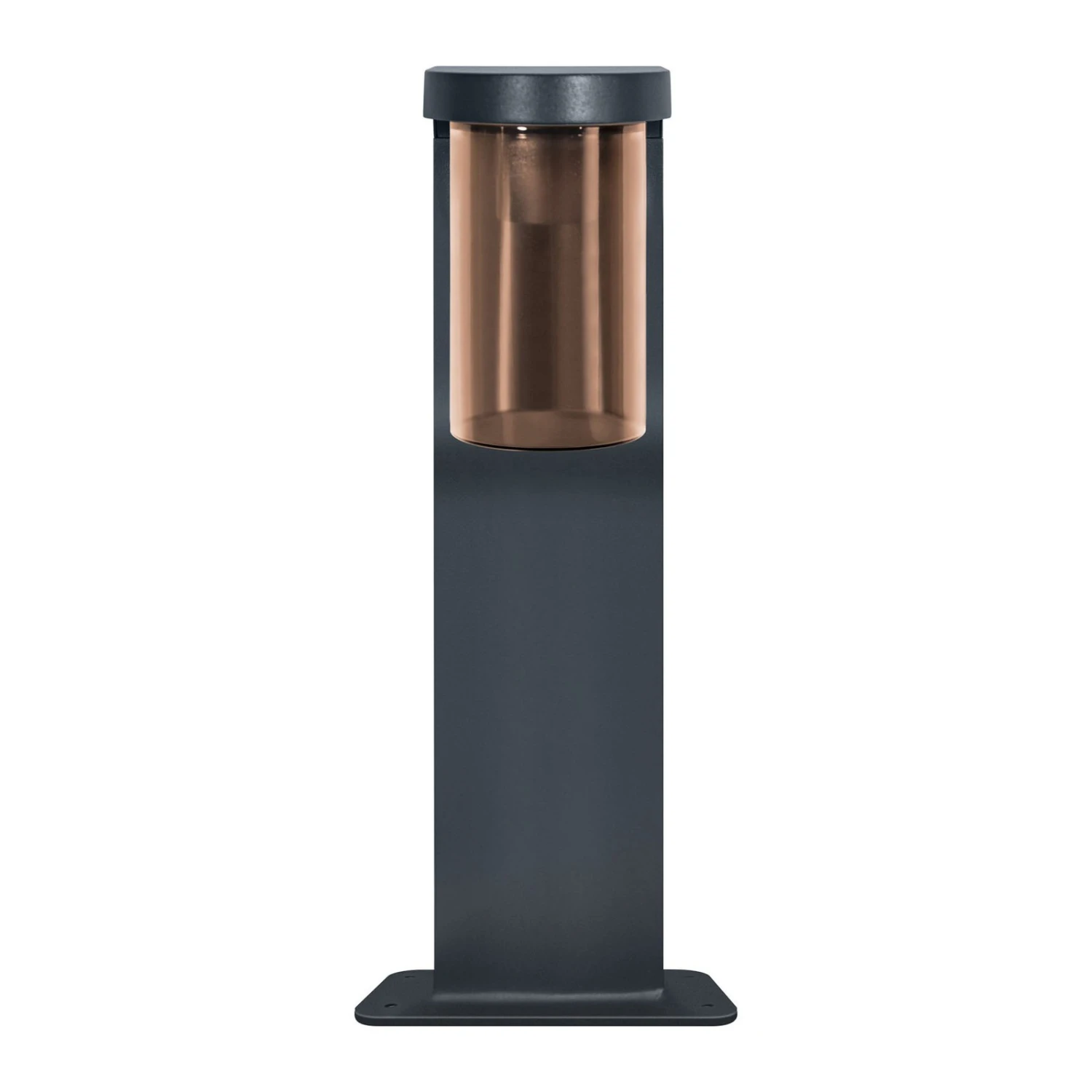 Im oberen Bereich wurde das aus Aluminium mit dunkelgrauem Finish (RAL 7016) gestaltete Gestell der Sockelleuchte Endura Classic Cascade im rechten Winkel nach vorne abgewinkelt. Hier sitzt der zylinderförmige Glasschirm der Sockelleuchte, der frei am Gestell nach unten hängt, so dass das Licht rundum durch das Glas abstrahlen kann. Eine besonders schöne Optik wird erzielt, wenn man in die E27-Fassung eine dekorative Filamentlampe einsetzt. Das Leuchtmittel wird nicht mitgeliefert, Befestigungsmaterial ist im Lieferumfang enthalten.
