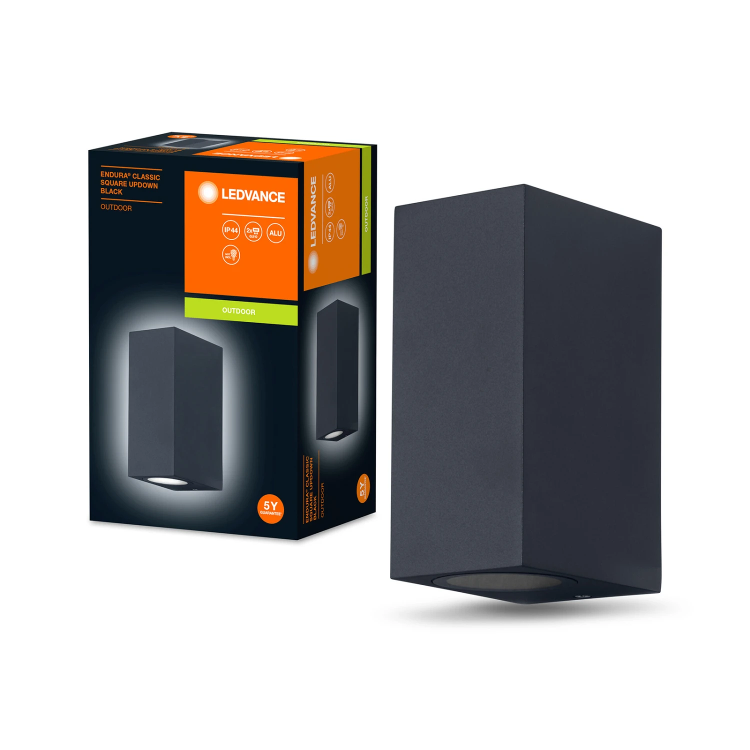 Einen nach oben gerichteten Lichtakzent an der Fassade und zugleich eine funktionale, nach unten gerichtete Ausleuchtung eines Eingangsbereichs oder Fußwegs ermöglicht die Außenwandlampe Endura Classic Square. Ihr quaderförmiger Korpus aus Aluminium in einfarbigem Finish beherbergt je eine GU10-Fassung an Ober- und Unterseite zur Bestückung mit dem bevorzugten Leuchtmittel.