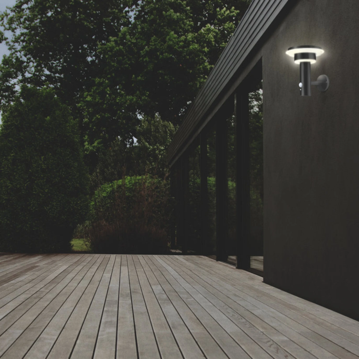 Überall dort, wo zur Installation einer herkömmlichen Wandleuchte kein Stromanschluss vorhanden ist, lässt sich mit der Solar-Wandleuchte Endura Style Double Circle mit integriertem Sensor für Beleuchtung sorgen. Die modern gestaltete, aus Edelstahl gefertigte Leuchte spendet bedarfsgerechte Beleuchtung und spart gleichzeitig Energie, da sie mit einem Bewegungs- und Tageslichtsensor ausgestattet ist, so dass sich das Licht nur dann einschaltet, wenn es benötigt wird. Der Bewegungssensor hat einen Erfassungswinkel von 90° und eine Reichweite von 6 Metern, der Schwellenwert beträgt 10 Lux.