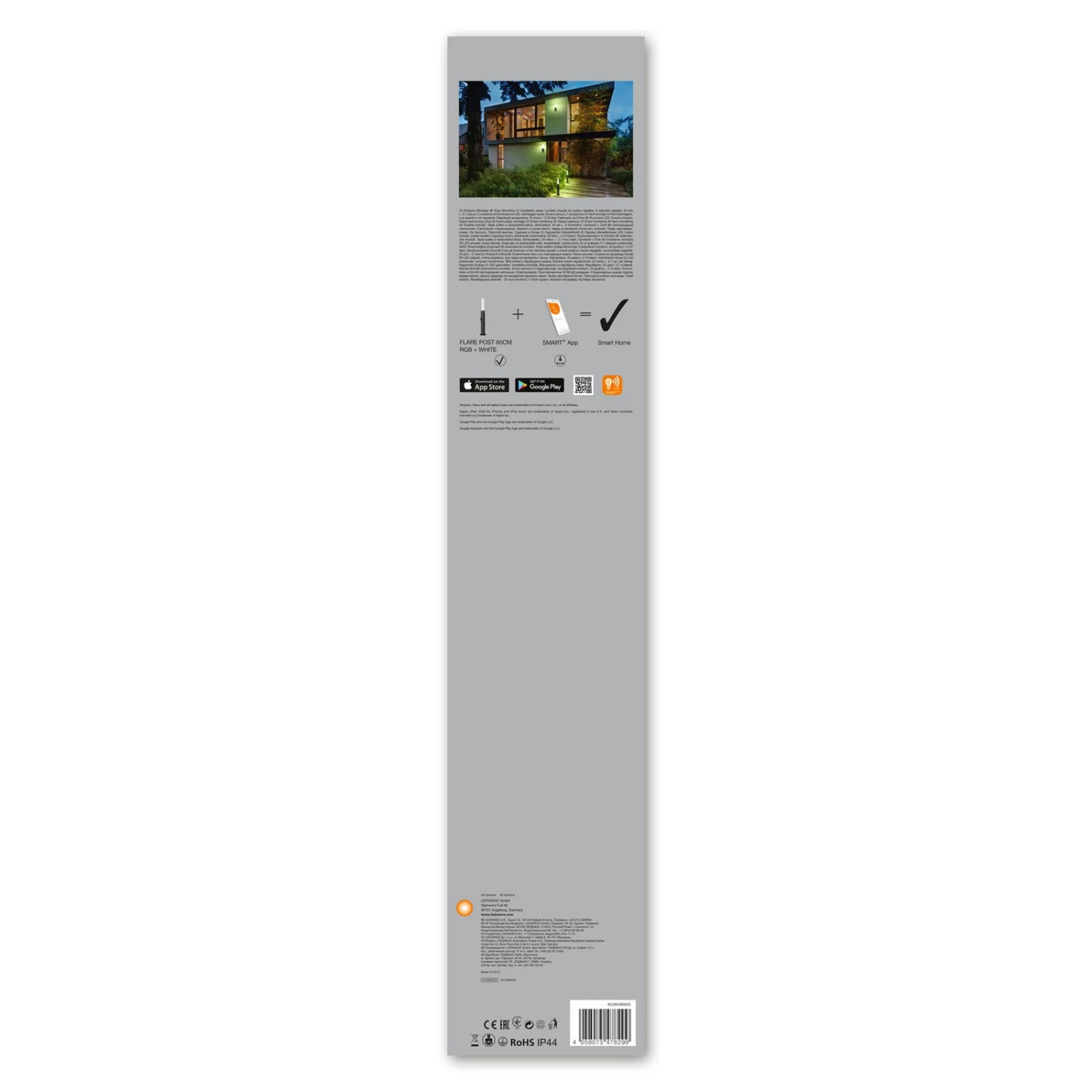Mit ihrem dunkelgrauen Aluminiumkorpus und dem oben anschließenden Diffusor aus innen opalem und außen klarem Polycarbonat wirkt die Wegeleuchte Flare schlicht und modern. Das Highlight ist die Funktionalität: Die RGBW-LEDs erlauben die Auswahl von warmweißem Licht und zahllosen bunten Tönen. Dies erfolgt per App oder Sprachbefehl. Da die LEDVANCE SMART+ WiFi-Technologie eine Koppelung mit dem Smartphone/Tablet mittels WLAN ermöglicht, ist kein Gateway/Bridge erforderlich.