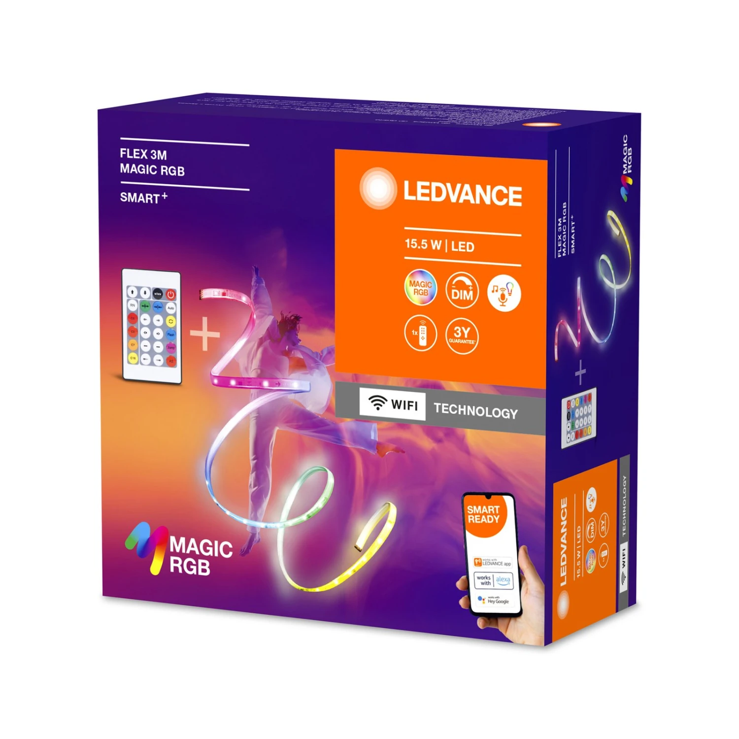 Mit bis zu 16 Mio. Farbmöglichkeiten, die zudem je Abschnitt einzeln regelbar sind, bietet der LED-Strip Flex Magic eine individuelle Ambientebeleuchtung für Wohn- und Aufenthaltsräume. Der biegsame und kürzbare Streifen kann perfekt auf die jeweilige Umgebung angepasst werden. Die Stromversorgung erfolgt dank beiliegendem Kabel mit Steckernetzteil über die Steckdose. Zur Steuerung (Schalten, Dimmen, Farbauswahl) wird eine Fernbedienung (inkl. Batterie) mitgeliefert. Ebenso ist ein Verteiler samt WiFi-Empfänger vorhanden, der die Koppelung des LED-Strips via WLAN ermöglicht. Hiernach kann die gesamte Konfiguration per App und die Steuerung auch per Sprachbefehl vorgenommen werden.