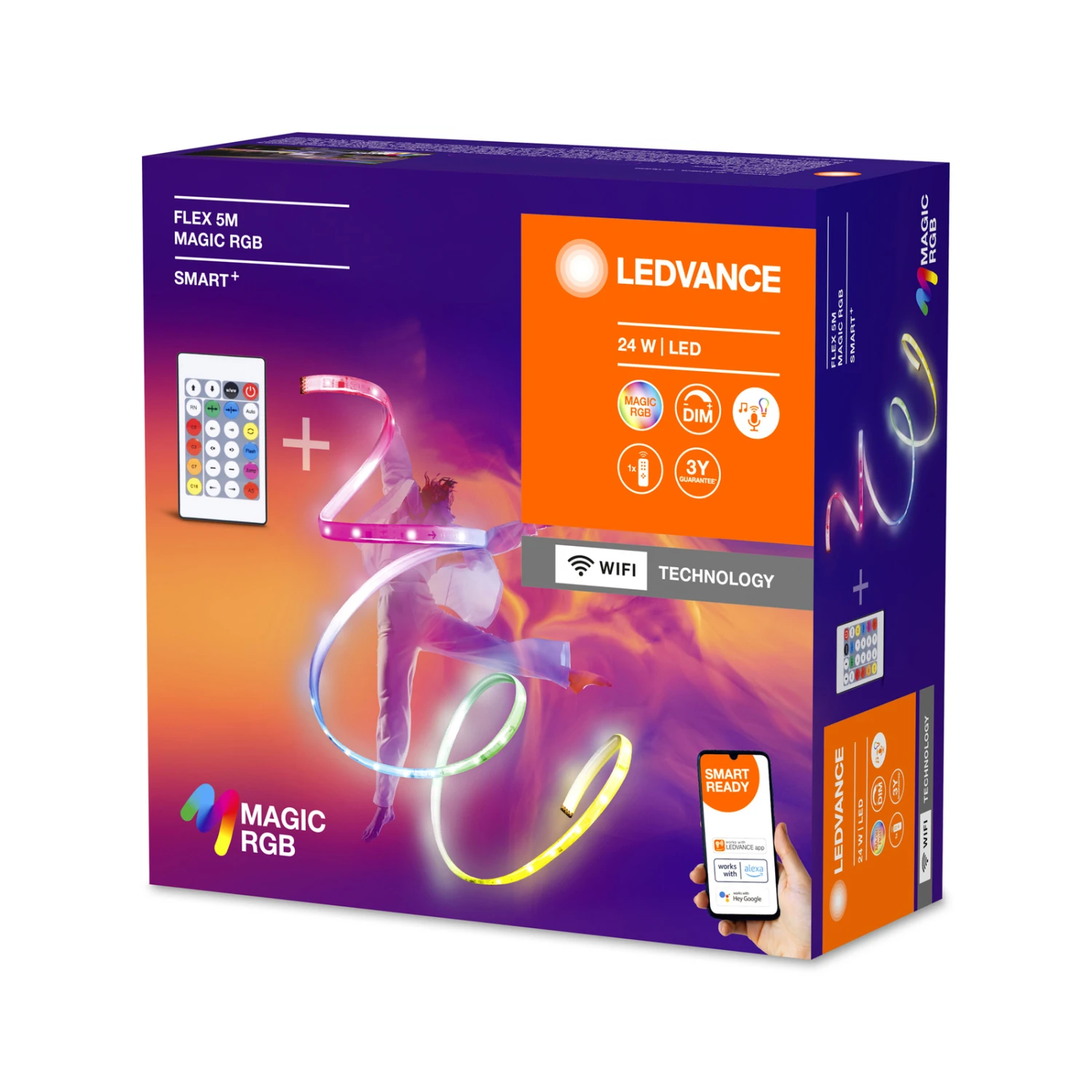 Mit bis zu 16 Mio. Farbmöglichkeiten, die zudem je Abschnitt einzeln regelbar sind, bietet der LED-Strip Flex Magic eine individuelle Ambientebeleuchtung für Wohn- und Aufenthaltsräume. Der biegsame und kürzbare Streifen kann perfekt auf die jeweilige Umgebung angepasst werden. Die Stromversorgung erfolgt dank beiliegendem Kabel mit Steckernetzteil über die Steckdose. Zur Steuerung (Schalten, Dimmen, Farbauswahl) wird eine Fernbedienung (inkl. Batterie) mitgeliefert. Ebenso ist ein Verteiler samt WiFi-Empfänger vorhanden, der die Koppelung des LED-Strips via WLAN ermöglicht. Hiernach kann die gesamte Konfiguration per App und die Steuerung auch per Sprachbefehl vorgenommen werden.