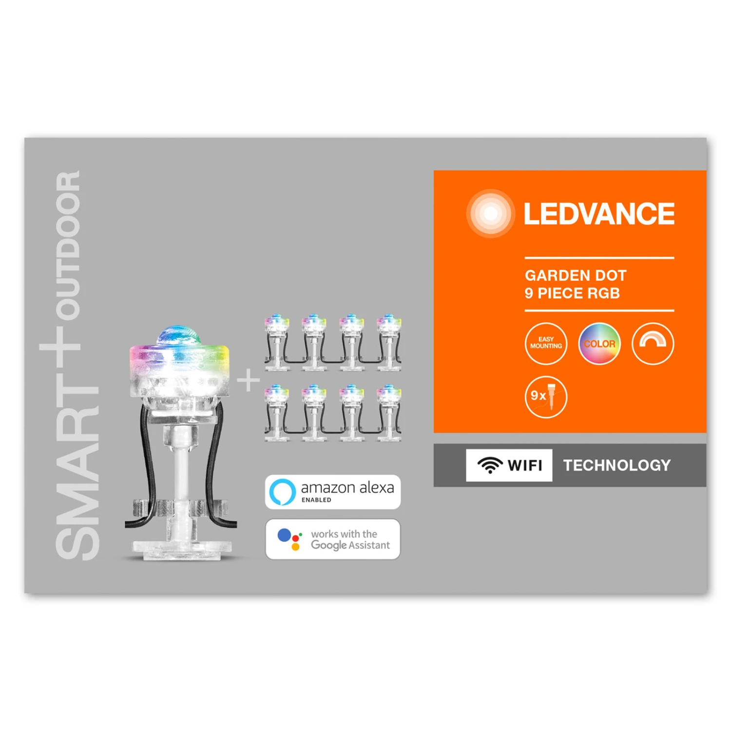 Die LED-Erdspießleuchte Garden Dot sorgt für farbenfrohe Lichtakzente in der Außenanlage. Die neun in Reihe verkabelten Leuchten sind aus klarem Polycarbonat gefertigt. Sie werden über einen gemeinsamen 230 V-Anschluss versorgt und über eine Controllerbox mit LEDVANCE SMART+ WiFi-Modul eingebunden. Letzteres ermöglicht die Koppelung der Leuchten mit dem Smartphone/Tablet über das WLAN, um eine smarte Steuerung per App oder Sprachbefehl vornehmen zu können. Zur Erweiterung auf eine Gruppe von maximal 18 Exemplaren sind geeignete Dreiersets über das Zubehör erhältlich.