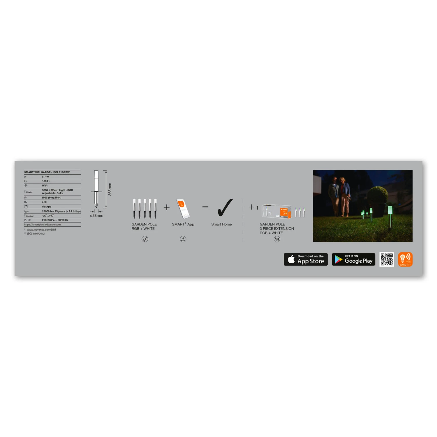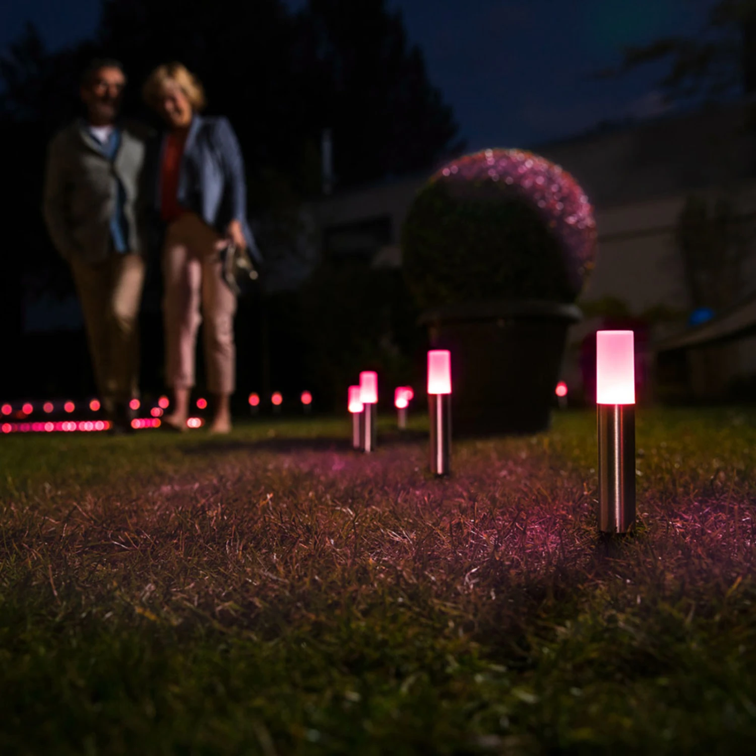 Die Erdspießleuchte Garden Pole in zylindrischer Form aus Edelstahl mit opalem Polycarbonat-Diffusor dient zur Lichtdekoration und Orientierungsbeleuchtung an Wegen, in Grünflächen und in Beeten. Im Lieferumfang sind fünf Leuchten, ein 230 V zu 5 V IP44-Steckertrafo, eine Controllerbox (LEDVANCE SMART+ WiFi Funkmodul zur Koppelung der Leuchten mit dem Tablet/Smartphone über das WLAN) und die notwendige Verkabelung enthalten. Per App oder Sprachbefehl kann die Lichtfarbe von Warmweiß zu einem beliebigen bunten Ton gewechselt werden. Bei Bedarf lässt sich die Gruppe mit dem 3er-Erweiterungsset (siehe Zubehör) auf acht Leuchten vergrößern.