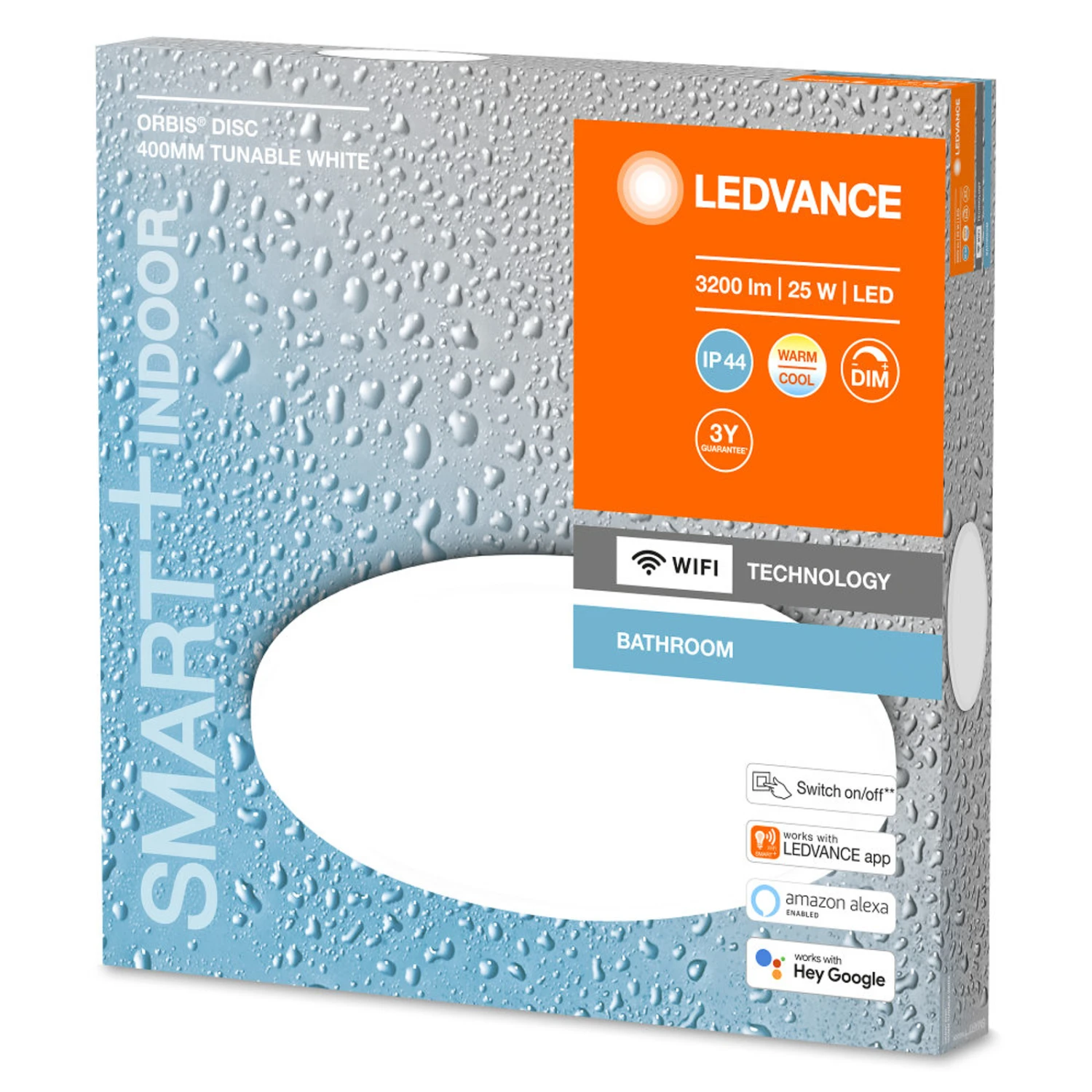 Die LED-Deckenleuchte Orbis Disc überzeugt durch ihre zeitlose Gestaltung und die zugleich modernen Funktionsweisen. Die Leuchte verfügt über Schutzart IP44 und wurde daher für die Verwendung in Badezimmern entwickelt. Sie besteht aus robustem Aluminium und fügt sich durch ihre runde Form und die weiße Farbgebung in zahlreiche Einrichtungsstile ein. Das Licht wird blendfrei abgestrahlt, außerdem lassen sich Farbtemperatur und Helligkeit über App oder Sprachbefehl steuern. Die Einbindung der Deckenleuchte erfolgt mit der LEDVANCE SMART+ WiFi-Technologie über WLAN.