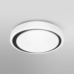 Die aus weißem Kunststoff gefertigte Deckenleuche Orbis Moon gliedert sich in einen schmalen, ringförmigen Rahmen und einem in Innern gelegenen leicht abgesetzten, runden Diffusor, der sich vor einem dunkleren Hintergrund absetzt. Die integrierten LEDs sind stufenlos dimmbar und in der Farbtemperatur regelbar. Dies erfolgt ganz modern via App, Sprachbefehl, da Orbis Moon dank LEDVANCE SMART+ WiFi-Technologie über das WLAN mit dem Tablet oder Smartphone koppelbar ist – ganz ohne Gateway/Bridge.