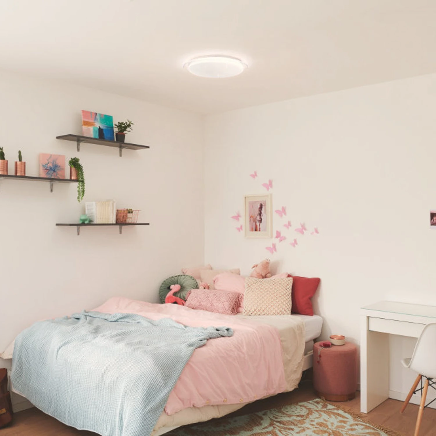 Die LED-Deckenlampe Orbis Sparkle besteht aus Stahl und Polycarbonat und kann sich dank ihrer zurückhaltenden Gestaltung in zahlreiche Wohnumgebungen einfügen. Egal, ob im Flurbereich, im Schlaf- oder Wohnzimmer – Orbis Sparkle macht überall eine gute Figur. Durch feine Einkerbungen im Diffusor entsteht zudem ein schöner Lichteffekt im Wohnraum. Die Helligkeit und die Farbtemperatur können mittels App oder Sprachbefehl gesteuert werden. Die Einbindung der Deckenleuchte erfolgt durch die LEDVANCE SMART+ WiFi-Technologie direkt über das WLAN.