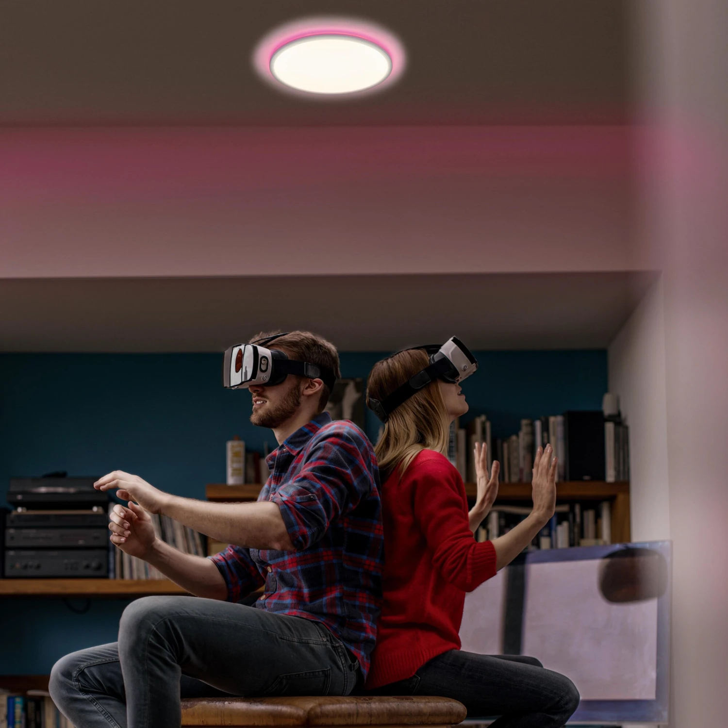 Die aus Kunststoff gefertigte LED-Deckenleuchte Orbis Ultra Slim Backlight setzt sich aus einem schmalen, runden Rahmen und flachen, opalen Diffusor zusammen. Neben den nach unten strahlenden LEDs sind rückseitig weitere Dioden integriert. Beide Lichtquellen können getrennt voneinander gesteuert werden. So lässt sich beispielsweise eine effektive Raumbeleuchtung in warmweißer bis tageslichtweißer Lichtfarbe mit bunter Deckenaufhellung erzielen. Via App auf dem Tablet/Smartphone oder per Sprachbefehl lassen sich die Helligkeit, Lichtfarbe und Farbtemperatur anpassen. Die Einbindung der Deckenlampe erfolgt mit der LEDVANCE SMART+ WiFi-Technologie über WLAN.
