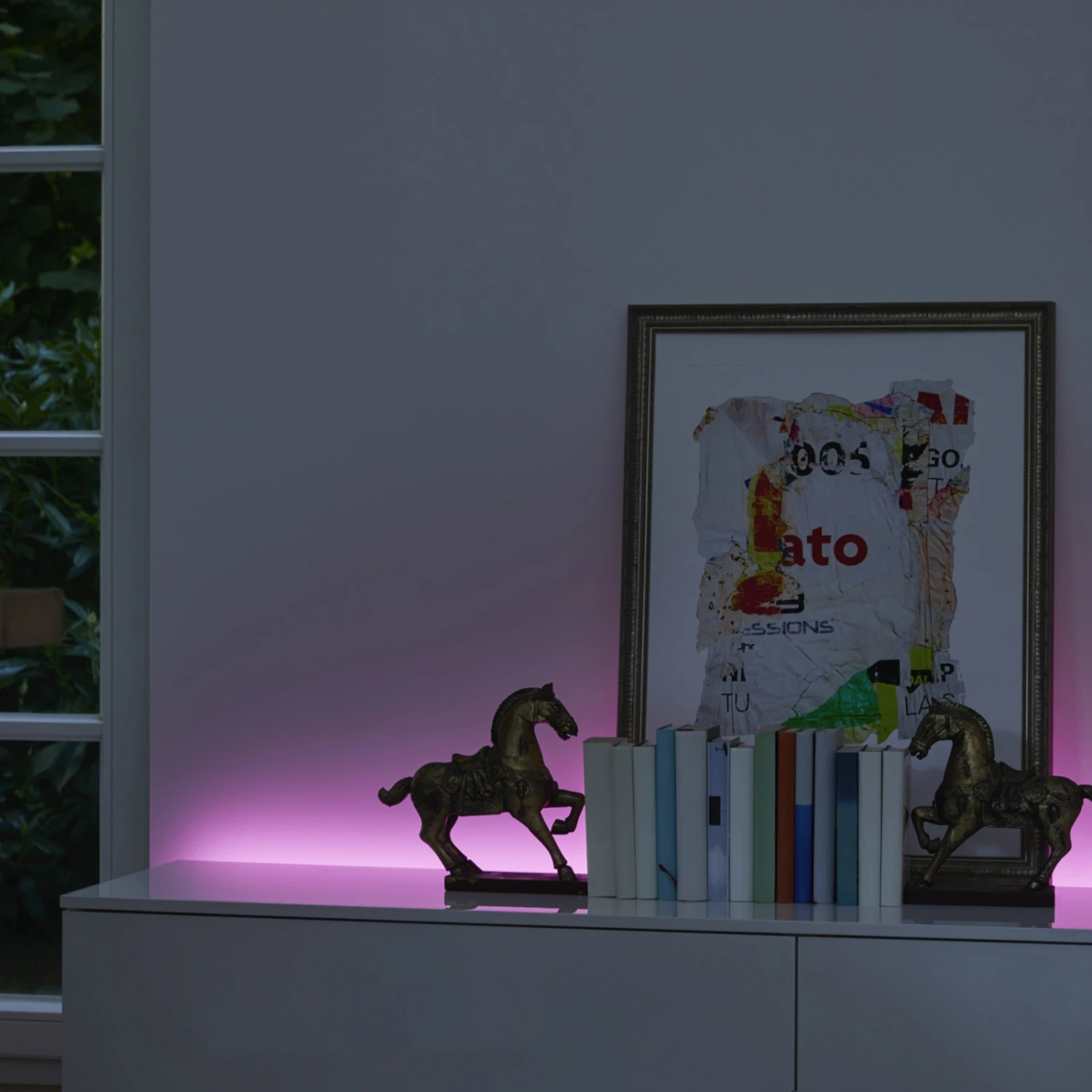 Das LED-Band ist selbstklebend, somit einfach zu installieren. Die gesamte Länge des Bandes ist in drei einzelne Streifen zu je 60 cm trennbar. Darüber hinaus gibt es die Möglichkeit, das System bis zu einer Gesamtlänge von 6 m zu erweitern. Das hier angebotene Basis-Set beinhaltet das LED-Lichtband LEDVANCE SMART+ Flex mit 180 cm Länge (3 x 60 cm) und das dazugehörige Netzteil.